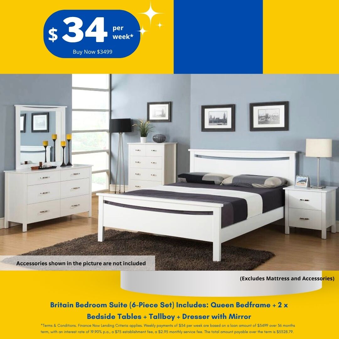 Britain Bedroom Suite refresh your restful retreat in a sophisticated style with a six-piece bedroom set showcasing a bed, a dresser and mirror, two bedsides, and a tallboy. Add a dash of dimension to your décor while its drawer pulls add shimmering style to any casual or formal aesthetic. Anchor your bedroom with this Britain Bedroom Suite in sleek modern style with this eye-catching platform bed.