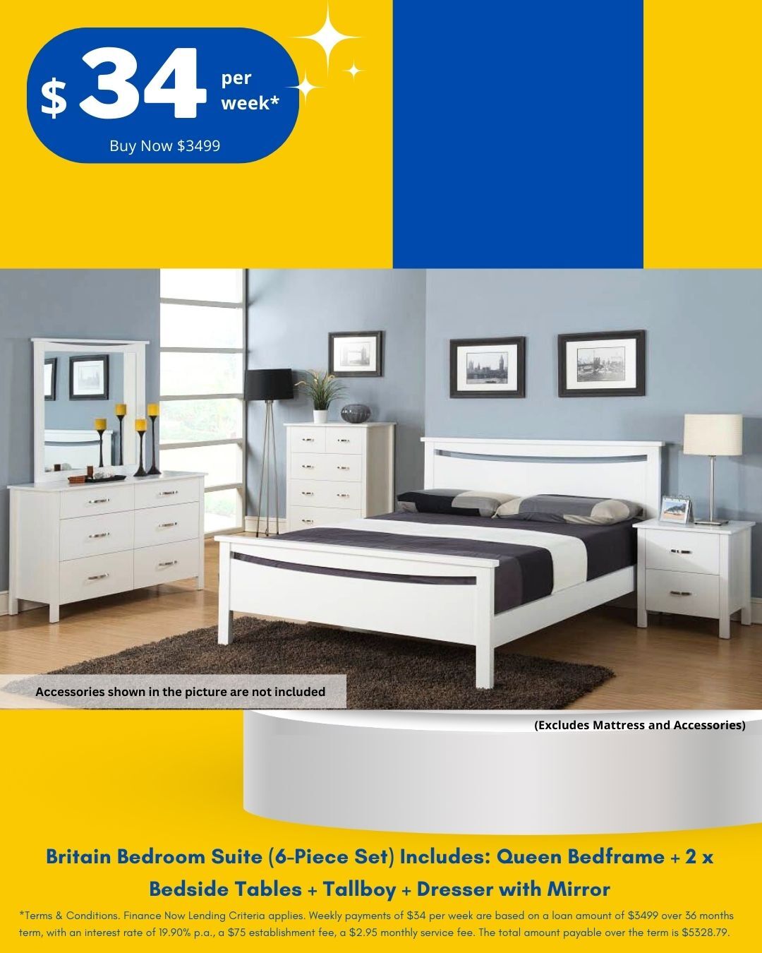 *Terms & Conditions. Finance Now Lending Criteria applies. Weekly payments of $34 per week are based on a loan amount of $3499 over 36 months term, with an interest rate of 19.90% p.a., a $75 establishment fee, a $2.95 monthly service fee. The total amount payable over the term is $5328.79.