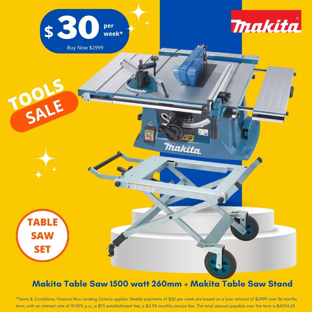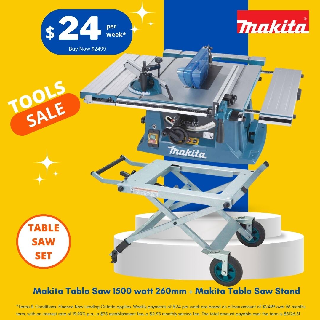 The Makita Table Saw Set NZ is a practical cutting package for workshops, renovation jobs, joinery work, and general site use. This combo includes a Makita 1500W 260mm table saw and a Makita table saw stand, giving you both the saw and a dedicated mobile support setup in one deal.