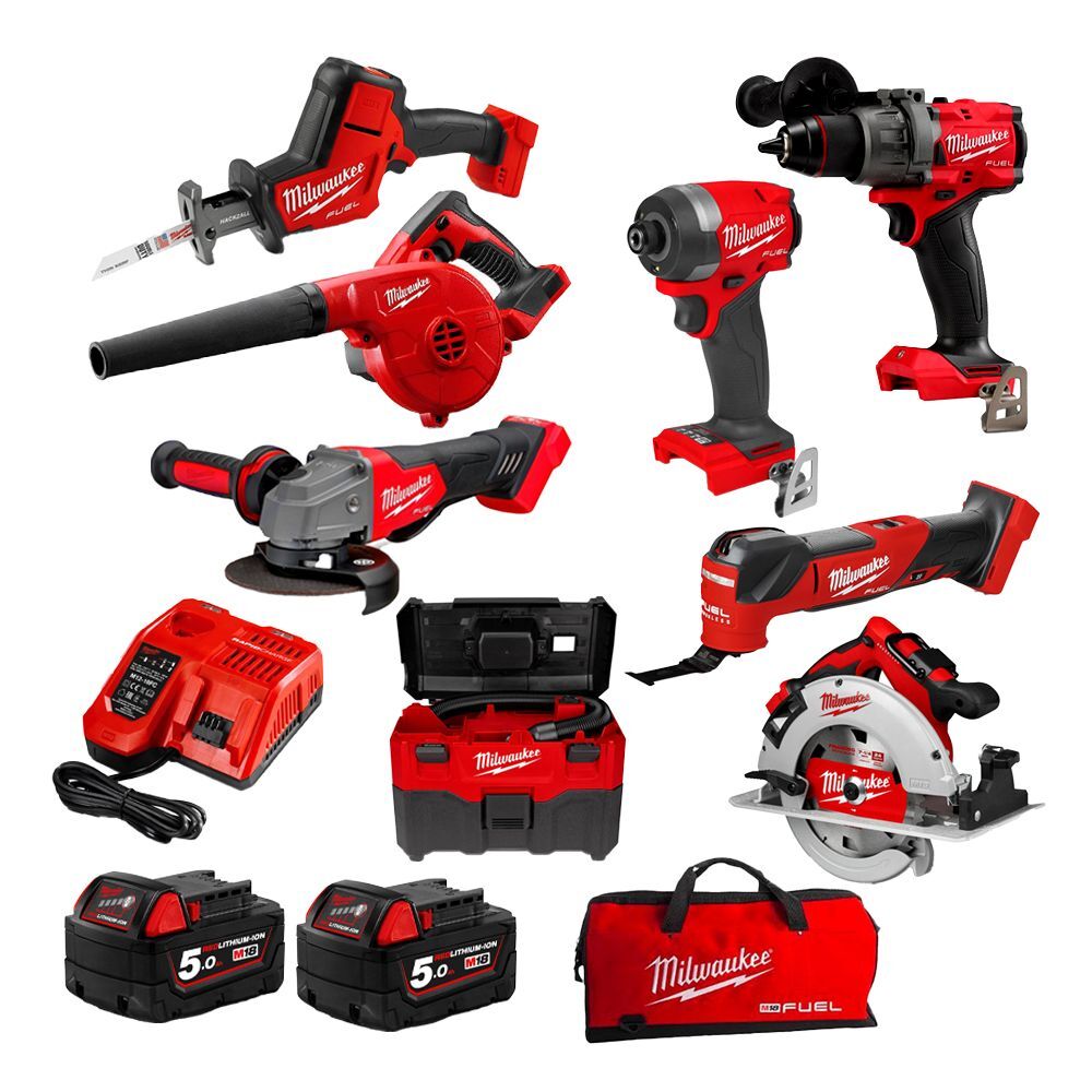 This combo kit includes the Milwaukee M18 FUEL 13mm Hammer Drill/Driver, 1/4″ Hex Impact Driver, 125mm Angle Grinder with Deadman Paddle Switch, Multi-Tool, 184mm Circular Saw, HACKZALL Reciprocating Saw, Compact Blower and 7.5 Litre Wet/Dry Vacuum. It also comes with 2 x 5.0Ah REDLITHIUM batteries, an M12 & M18 Rapid Charger and a contractor bag.