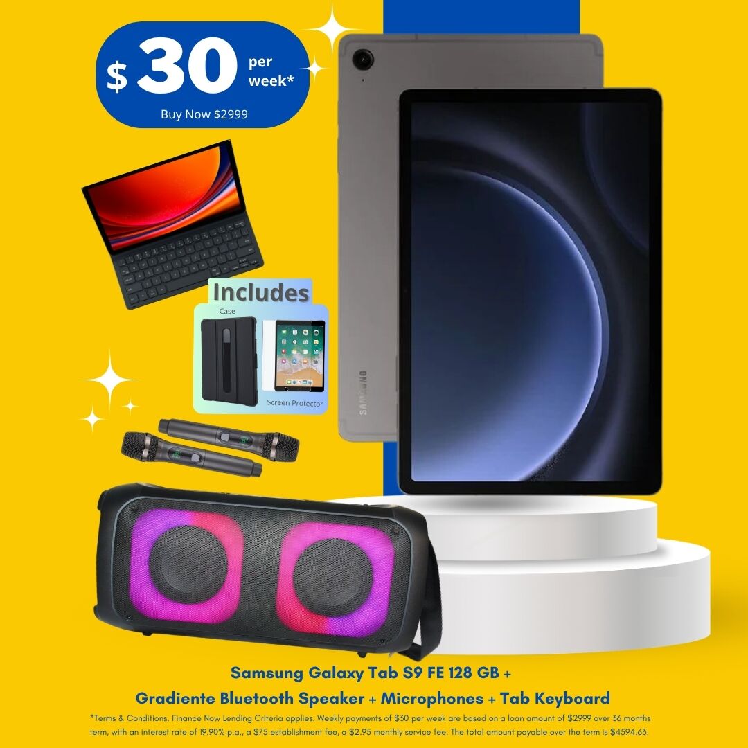 Samsung Galaxy Tab S9 FE 128GB Package Deal NZ is a practical and value-packed combo for work, study, streaming and everyday use. This package includes the Samsung Galaxy Tab S9 FE 128GB, Gradiente Bluetooth speaker, microphones, tab keyboard, case and screen protector. It is a great choice for customers wanting a tablet setup with useful extras in one deal.