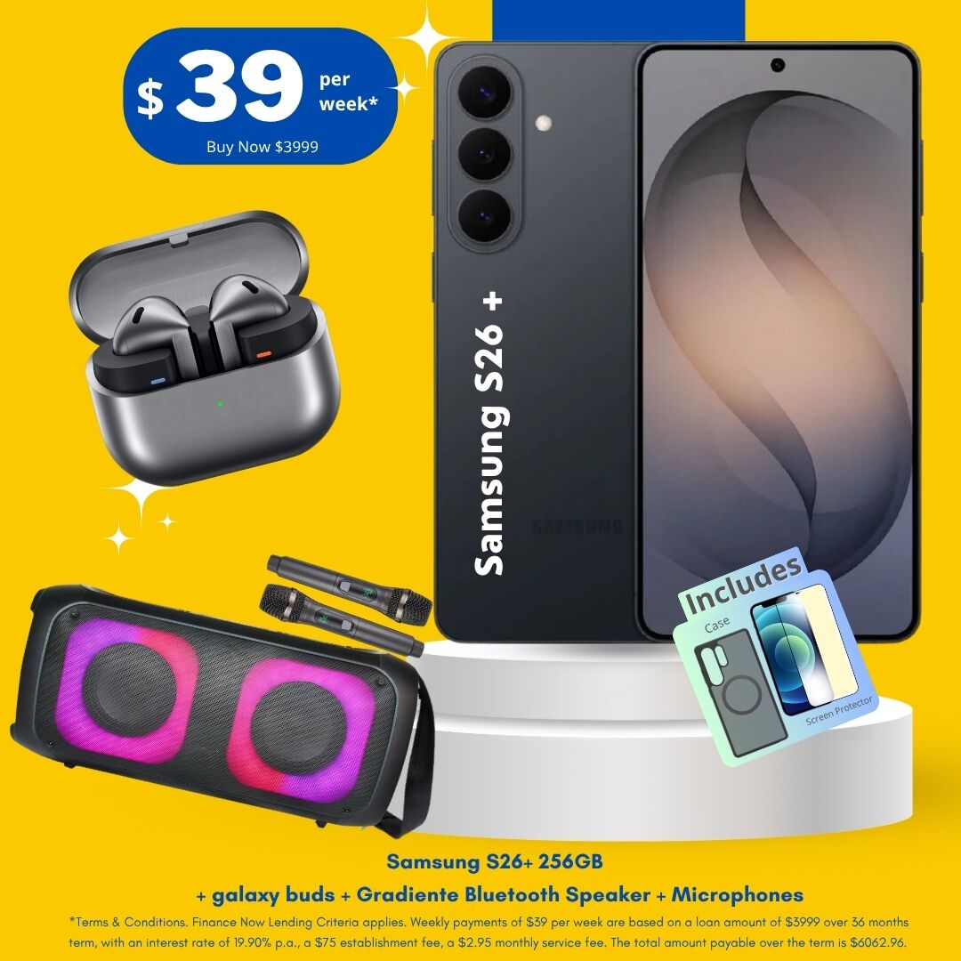 Samsung S26 Plus 256GB Package Deal NZ is a premium combo for customers who want a powerful smartphone with useful extras in one deal. This package includes the Samsung S26 Plus 256GB, Galaxy Buds, Gradiente Bluetooth speaker, microphones, case and screen protector. It is a great choice for music, calls, entertainment, content and everyday use. Samsung says Galaxy S26+ in New Zealand is available with 12GB memory and 256GB or 512GB storage options.