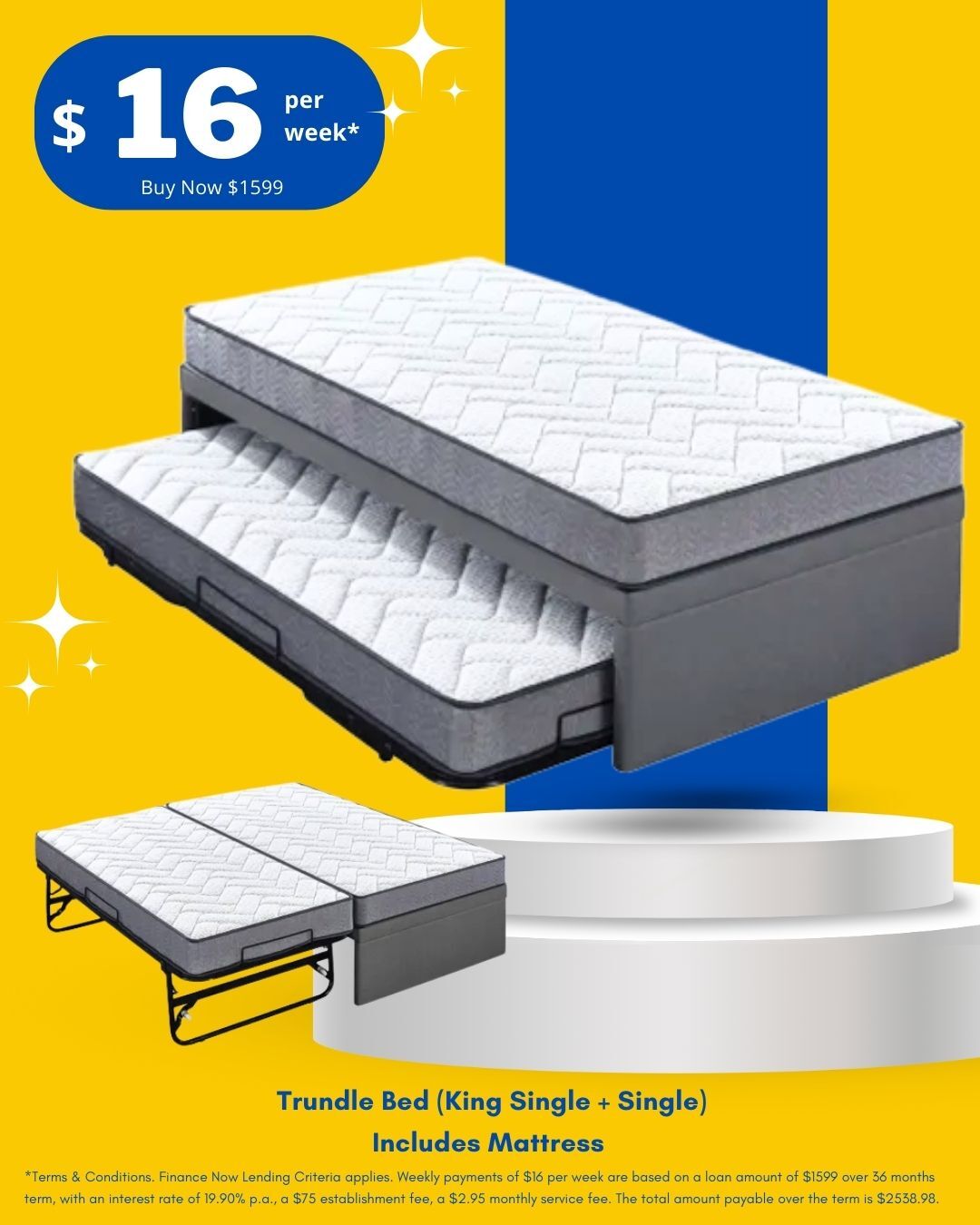 *Terms & Conditions. Finance Now Lending Criteria applies. Weekly payments of $16 per week are based on a loan amount of $1599 over 36 months term, with an interest rate of 19.90% p.a., a $75 establishment fee, a $2.95 monthly service fee. The total amount payable over the term is $2538.98.