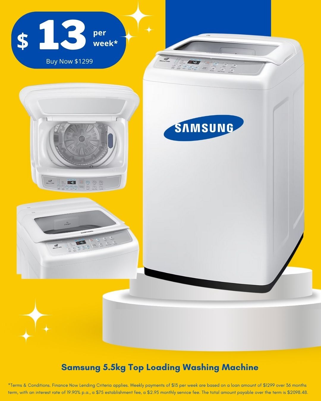 *Terms & Conditions. Finance Now Lending Criteria applies. Weekly payments of $13 per week are based on a loan amount of $1299 over 36 months term, with an interest rate of 19.90% p.a., a $75 establishment fee, a $2.95 monthly service fee. The total amount payable over the term is $2098.48.